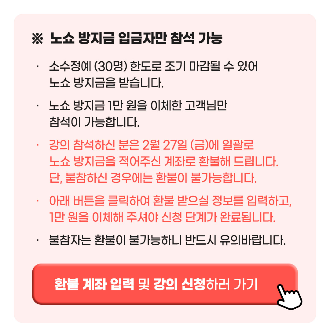C타입 (오프라인 강의 상품) 진행되는 총 강의 회차를 기준으로 포인트 환원 금액을 계산합니다. 첫 강의 시작 전 : 100% 환원 총 강의 회차에서 1/3 경과 전 : 사용한 포인트의 2/3 해당액 총 강의 회차에서 1/2 경과 전 : 사용한 포인트의 1/2 해당액 총 강의 회차에서 1/2 경과 후 : 환원 불가 ※ 강의 미참석 회차의 강의는 환원 불가, 보강/대리수강 불가 ※ 학원의 설립, 운영 및 과외교습에 관한 법률 시행령 <개정 2020.3.31> 교습비 등 반환기준 (제 18조 제 3항 관련) 의거