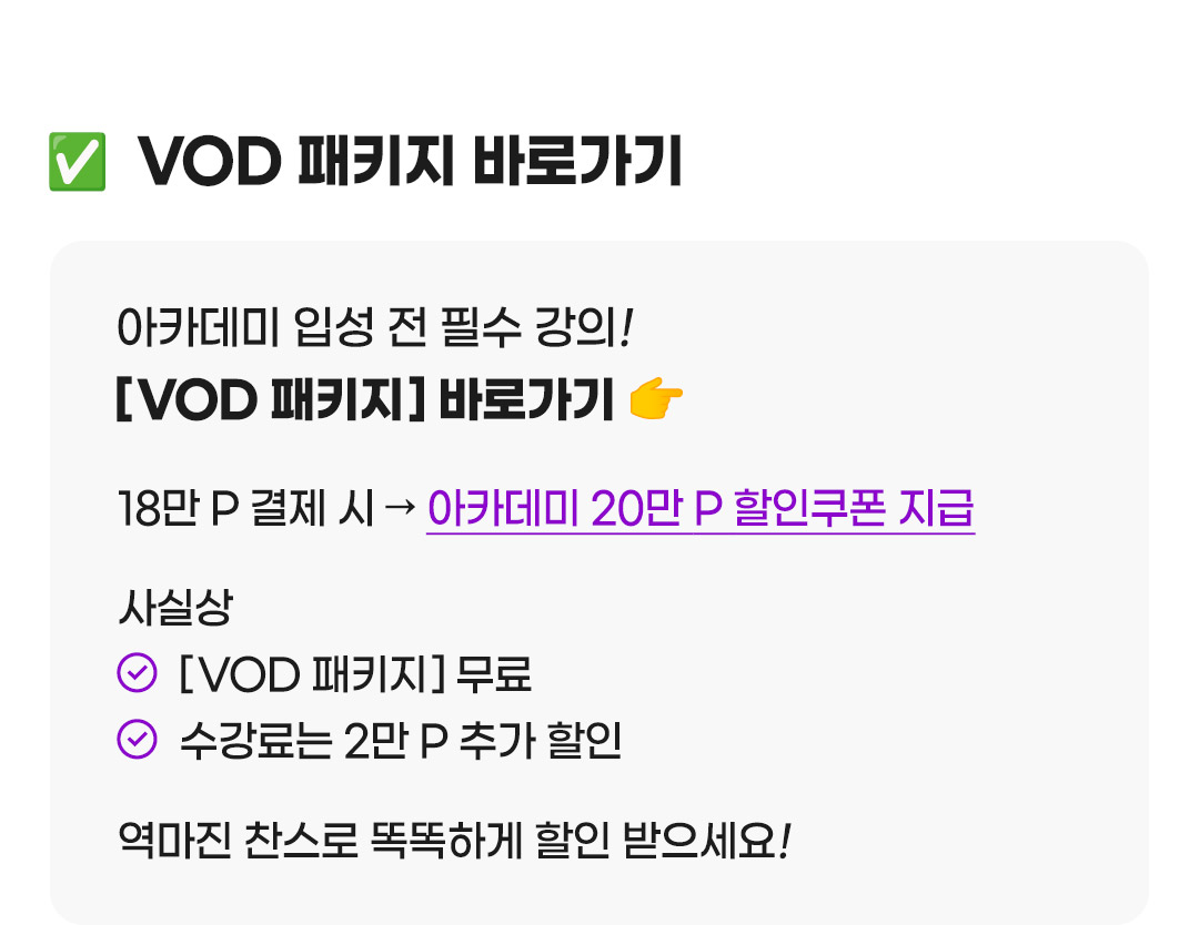 C타입 (오프라인 강의 상품) 진행되는 총 강의 회차를 기준으로 포인트 환원 금액을 계산합니다. 첫 강의 시작 전 : 100% 환원 총 강의 회차에서 1/3 경과 전 : 사용한 포인트의 2/3 해당액 총 강의 회차에서 1/2 경과 전 : 사용한 포인트의 1/2 해당액 총 강의 회차에서 1/2 경과 후 : 환원 불가 ※ 강의 미참석 회차의 강의는 환원 불가, 보강/대리수강 불가 ※ 학원의 설립, 운영 및 과외교습에 관한 법률 시행령 <개정 2020.3.31> 교습비 등 반환기준 (제 18조 제 3항 관련) 의거