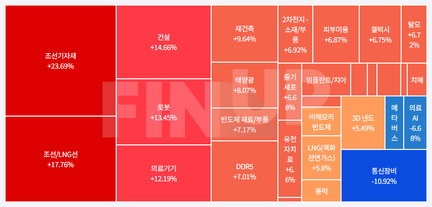 시장 마감 현황 KOSPI 3219.59pt / +0.45% KOSDAQ 818.60pt / +0.89% 연결 선물 지수 435.15pt / +0.36% 시장 등락 현황 KOSPI 상승: 543(↑1) / 하락: 325(↓0) KOSDAQ 상승: 947(↑3) / 하락: 670(↓0) 시장 수급 현황 * 단위: 억 원 KOSPI 개인-3,851 / 외국인+2,304 / 기관+777 KOSDAQ 개인-119 / 외국인-348 / 기관+506 연결 선물 지수 개인+2,714 / 외국인-4,587 / 기관+1,665 테마록 특징 테마 정부 주택 공급 정책 2030년까지 수도권 연 27만호 신규주택 착공…총 135만호 공급 [특징주] KD·동신건설 등 건설 중소형 관련주 강세…정부 부동산 대책 발표 건설 KD (+30% / 144억) 동신건설 (+15.16% / 174억) 동부건설 (+10.74% / 27억) 금호건설 (+9.38% / 38억) 상지건설 (+8.04% / 197억) 엔알비 (+7.78% / 450억) 재건축 금강공업 (+14.86% / 422억) 동부건설 (+10.74% / 27억) 에넥스 (+7.64% / 8억) 벽산 (+7.48% / 16억) 조광페인트 (+7.47% / 25억) KCC건설 (+6.77% / 2억) 로봇 “직원 너무 많으면 언제 파업할지 몰라”…노조 목소리 커질수록 로봇주 각광 화승알앤에이 (+30% / 424억) PS일렉트로닉스 (+12.65% / 1,128억) 한국피아이엠 (+10.43% / 383억) 클로봇 (+7.3% / 3,373억) 이삭엔지니어링 (+6.88% / 270억) 현대무벡스 (+5.19% / 243억) 조선 K조선 年 목표 달성 자신…하반기 대형 프로젝트 노려 [특징주] 한라IMS·세진중공업 등 조선기자재 관련주 강세 조선/LNG선 동일스틸럭스 (+29.93% / 138억) 한라IMS (+22.95% / 1,165억) 세진중공업 (+21.76% / 2,436억) 한국카본 (+7.24% / 284억) 엔케이 (+6.92% / 734억) 동성화인텍 (+6.07% / 165억) 조선기자재 씨피시스템 (+29.92% / 461억) 오리엔탈정공 (+23.86% / 1,735억) 한라IMS (+22.95% / 1,165억) 세진중공업 (+21.76% / 2,436억) KS인더스트리 (+19.98% / 92억) 대양전기공업 (+11.89% / 191억) 의료기기 "K뷰티에 열광…미용주사 맞으러 미국서 한국 가는 여성들" 엘앤케이바이오 (+17.6% / 254억) 엘앤씨바이오 (+16.13% / 3,116억) 원텍 (+10.93% / 297억) 한스바이오메드 (+8.7% / 11억) 바이오노트 (+7.58% / 15억) 파마리서치 (+7.14% / 519억) 태양광 중국 구조조정 효과 나타나기 시작…태양광株 강세 유니테스트 (+11.04% / 312억) HD현대에너지솔루션 (+10.32% / 298억) 대명에너지 (+7.09% / 21억) OCI홀딩스 (+6.09% / 260억) SK이터닉스 (+5.8% / 244억) 신성이엔지 (+3.77% / 70억) 반도체 재료/부품 삼성 평택 5공장 착공 재개 '시동'…HBM4 공급 준비 가닥 머스크, 삼성 생산할 AI6에 “단연 최고의 칩 될 것” 솔브레인홀딩스 (+10.06% / 118억) 웨이비스 (+6.98% / 14억) 테크윙 (+6.5% / 424억) 젬백스 (+6.37% / 137억) 그린리소스 (+5.95% / 53억) 이엔에프테크놀로지 (+5.83% / 100억) 특징 뉴스 정리 •상한가 KD (+30.0% / 144억) [특징주] KD·동신건설 등 건설 중소형 관련주 강세…정부 부동산 대책 발표 화승알앤에이 (+30.0% / 424억) 화승알앤에이, 과기부 '피지컬 AI' 사업 참여 소식에 '上'[특징주] 동일스틸럭스 (+29.93% / 138억) K조선 年 목표 달성 자신…하반기 대형 프로젝트 노려 동일스틸럭스는 대선조선을 인수한 컨소시엄 중 최대 지분을 보유, 대선조선은 소형 선박의 건조 및 수리업을 영위 씨피시스템 (+29.92% / 461억) 씨피시스템, MASGA 핵심 조선사에 특수케이블체인 공급 •특징 뉴스 정리 오리엔탈정공 (+23.86% / 1,736억) “오리엔탈정공, LNG 운반선·군함 건조 시장 확대로 수혜 기대” 한라IMS (+22.95% / 1,166억) [특징주] 한라IMS·세진중공업 등 조선기자재 관련주 강세 세진중공업 (+21.76% / 2,436억) [특징주] 세진중공업, 현대重 컨테이너선 수주 소식에 22% 급등...9거래일... 메타바이오메드 (+21.21% / 299억) [특징주]메타바이오, '쇼티지' 3.6조 봉합사 시장서 다수의 계약 진행…저평가 탈피 KS인더스트리 (+19.98% / 92억) K조선 年 목표 달성 자신…하반기 대형 프로젝트 노려 선박용 크레인 등 선박구성부분품을 제조 및 판매하는 조선기자재 사업을 주요사업으로 영위 삼목에스폼 (+17.69% / 64억) 삼목에스폼, 대주주 공개매수 소식에 15% 급등 엘앤케이바이오 (+17.6% / 255억) 엘앤케이바이오, 글로벌 메이저사와 제품 공급 위한 고위급 실무 논의 엘앤씨바이오 (+16.13% / 3,116억) 엘앤씨바이오 "'리투오' 기반 피부 재생 기업으로 전환 중" 동신건설 (+15.16% / 174억) [특징주] KD·동신건설 등 건설 중소형 관련주 강세…정부 부동산 대책 발표 금강공업 (+14.86% / 423억) [특징주] KD·동신건설 등 건설 중소형 관련주 강세…정부 부동산 대책 발표 데크플레이트 및 강관 생산. 거푸집류인 알루미늄폼, 갱폼, 유로폼 제조. 아이엠비디엑스 (+11.93% / 325억) [특징주] 아이엠비디엑스, 액체생검 '캔서디텍트' 혁신 의료 기술 선정... 대양전기공업 (+11.89% / 192억) K조선 年 목표 달성 자신…하반기 대형 프로젝트 노려 선박용 조명등기구 선두업체. 산업용 조명등기구, 전자시스템, 전기배전반 등을 생산 판매하고 있으며, 조선 기자재, 방위산업, 철도차량, 육상용 조명산업 등에 제품을 공급 중 화인베스틸 (+11.29% / 98억) K조선 年 목표 달성 자신…하반기 대형 프로젝트 노려 조선업에 특화된 앵글형강 제품을 생산하고 있음. 주요 매출처는 현대중공업, 현대미포조선, 현대삼호중공업, 대우조선해양 등 조선업체임. 유니테스트 (+11.04% / 313억) 중국 구조조정 효과 나타나기 시작…태양광株 강세 (25-07-25) [공시속보] 유니테스트, 태양광발전소 건설공사 
