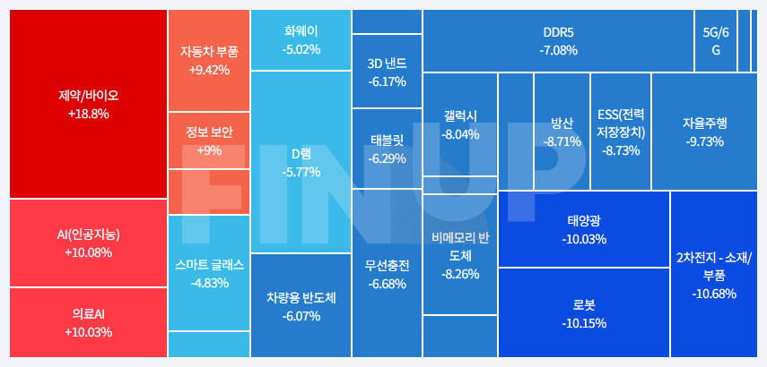 시장 마감 현황 KOSPI 4004.42pt / -2.85% KOSDAQ 901.89pt / -2.66% 연결 선물 지수 565.50pt / -3.03% 시장 등락 현황 KOSPI 상승: 173(↑3) / 하락: 734(↓0) KOSDAQ 상승: 346(↑5) / 하락: 1,314(↓0) 시장 수급 현황 * 단위: 억 원 KOSPI 개인+25,659 / 외국인-25,186 / 기관-790 KOSDAQ 개인+5,647 / 외국인-5,997 / 기관+419 연결 선물 지수 개인-7,309 / 외국인-1,132 / 기관+8,116 테마록 특징 테마 AI 인프라 네이버, AI 인프라 투자 강화…"GPU에 향후 1조원 이상 투입"(종합) 정보보안 카티스 (+29.98% / 228억) 에스투더블유 (+5.21% / 296억) 수산아이앤티 (+3.98% / 2억) SGA솔루션즈 (+2.97% / 2억) 벨로크 (+2.88% / 3억) 더존비즈온 (+2.73% / 413억) AI (인공지능) 노타 (+29.78% / 7,673억) 인지소프트 (+6.14% / 13억) 에스투더블유 (+5.21% / 296억) 미디어젠 (+4.94% / 1억) NAVER (+4.31% / 9,315억) 메타랩스 (+4.26% / 9억) 제약/바이오 제약바이오협회, 복지부 'K-AI 신약개발 R&D' 총괄기관 선정 에이비프로바이오 (+29.95% / 22억) 경남제약 (+29.9% / 338억) 툴젠 (+14.54% / 117억) 티움바이오 (+10.89% / 148억) 케이바이오 (+8.71% / 78억) 에이프로젠 (+7.82% / 59억) 의료AI [단독] 백악관 대변인 “K-화장품 바른 내 피부, 이보다 더 좋은 적 없었다” 온코크로스 (+22.09% / 277억) 신테카바이오 (+14.15% / 158억) 셀바스헬스케어 (+5.24% / 36억) 미디어젠 (+4.94% / 1억) 제이에스링크 (+3.73% / 55억) 쓰리빌리언 (+3.58% / 160억) 자동차 부품 현대차·기아 수요응답형 셔클, 헝가리서 첫 해외 시범사업 성료 한국타이어, 북미 최대 자동차 부품 박람회 '2025 세마쇼' 참가 케이엔알시스템 (+14.83% / 498억) 디아이씨 (+10.08% / 1,951억) SJG세종 (+9.26% / 280억) 일정실업 (+8.53% / 118억) 태원물산 (+4.38% / 0억) DN오토모티브 (+4.02% / 38억) 반도체 재료/부품 SK하이닉스, HBM 등 메모리 15종에 친환경 인증 동운아나텍 (+14.71% / 183억) 한솔아이원스 (+10.15% / 239억) 제이아이테크 (+7.94% / 37억) 해성디에스 (+7.45% / 320억) 샘씨엔에스 (+4.04% / 176억) 대덕 (+3.31% / 24억) 의료기기 정부, 첨단 의료기기 R&D에 7년간 9천400억 투자 한스바이오메드 (+9.29% / 297억) 메타바이오메드 (+6.46% / 56억) 셀바스헬스케어 (+5.24% / 36억) 명인제약 (+5.08% / 556억) 롤링스톤 (+4.97% / 10억) 특징 뉴스 정리 •상한가 유투바이오 (+29.99% / 160억) [특징주] 유투바이오, 창업자-최대주주 경영권 갈등 속 상한가 카티스 (+29.98% / 228억) 카티스, 양자내성암호 기반 보안 플랫폼 출시에 7%↑[특징주] 에이비프로바이오 (+29.95% / 23억) [특징주]에이비프로바이오, 美 학회 전임상 발표 소식에↑ 코오롱모빌리티그룹 (+29.95% / 287억) 코오롱모빌리티그룹, 증시 변동성에도 상한가 직행 일동홀딩스 (+29.94% / 435억) 일동제약·일동홀딩스, 모두 급등…특히 일동제약 15% 상승 경남제약 (+29.9% / 339억) [특징주] 증시 변동성 커지자…헬스케어·통신株 강세 노타 (+29.78% / 7,674억) [ET특징주]노타, 코스닥 상장 셋째날도 상승세 •특징 뉴스 정리 온코크로스 (+22.09% / 278억) [N2 특징주] 온코크로스, 의료AI株 기대감...주가 급등 대한광통신 (+17.93% / 2,368억) [특징주] 대한광통신, 삼성전자-현대차 등과 ‘K-양자 산업 연합’ 참여 소식에 상승세 핀텔 (+17.22% / 156억) [코스닥 상장사 매물 분석]'상장 3년만에 매각' 핀텔, 새주인 자금납입 능력 '글쎄' 유라클 (+16.6% / 809억) 유라클 주가 21% 강세...퓨리오사 AI와 전략적 협약 툴젠 (+14.89% / 117억) [이재상의 하프타임 빅매치] 툴젠, ‘유전자 교정’ 선구자… 올 연말 바이오의 반격 준비! 동운아나텍 (+14.43% / 180억) (25-10-31) [코스닥 신사업 '옥석가리기']동운아나텍, 헬스케어·전장부품 성과 '언제쯤' 시스템 반도체 전문 팹리스 기업 케이엔알시스템 (+14.33% / 494억) (25-10-15) [특징주]케이엔알시스템, 로봇용 EHA 세계 첫 개발 및 특허 출원에 강세 신테카바이오 (+12.62% / 158억) [ET특징주]신테카바이오, 구글 쿠버네티스 엔진 환경 구축 소식에 상승... 코리아써키트 (+12.56% / 676억) 금일 특징 이슈 파악 어려움. PCB 제조 및 판매를 위해 설립되어 통신기기 HDI와 반도체 Package Substrate 부문을 주력. 형지I&C (+12.36% / 154억) [특징주] 국정원 “북미 회담 가능성 커”… 분석에 대북 테마주 ‘들썩... 코데즈컴바인 (+12.13% / 1,084억) [특징주] 남북경협주, 국정원 북미 정상회담 가능성 제기 '급등' 이노인스트루먼트 (+10.74% / 117억) 금일 특징 이슈 파악 어려움. 통신장비 5G/6G 관련주 대덕전자 (+10.41% / 4,433억) 대덕전자, 11월 5일 장중 43,850원 11.29% 상승 한스바이오메드 (+10.18% / 294억) (25-11-04) 한스바이오메드, ‘Korea Derma 2025’서 민트리프트·셀르디엠 선봬 디아이씨 (+10.08% / 1,941억) (25-11-03) [특징주] 디아이씨, “현대차 엔비디아 블랙웰 5만장 공급” AI 팩토리 구축에 핵심 공급사 부각되며 ‘상한가‘ 대덕전자 (+9.64% / 4,462억) 폭락장 속 신고가 기록한 이 종목[특징주] 스톤브릿지벤처스 (+9.55% / 250억) [특징주] 스톤브릿지벤처스, AI바이오 역대급 엑시트 규모에 ↑…노타 ... ISC (-9.2% / 402억) [특징주] 반도체 장비·부품주, 차익실현 매물 쏟아지며 일제히 '급락' 이수페타시스 (-9.21% / 3,570억원) 이수페타시스, 10월 31일 장중 112,400원 4.46% 상승 - 강유진 기자 로보티즈 (-10.41% / 3,663억) 로보티즈, 유상증자 발행가액 높여…유증 규모 1000억원→2098억원 티로