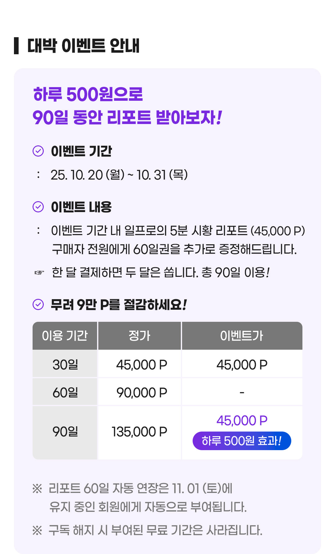 E타입 (개별 상품 포함 기간제 정액 패키지 상품) 7일 이내 이용 이력이 없는 경우에는 포인트 취소 및 포인트 환원이 가능합니다. 단, 자동결제 상품의 경우 구독 시 사용된 결제수단으로 결제 취소 처리가 됩니다. 구독 후 다음에 해당하는 콘텐츠 유료 서비스 사용 이력이 있는 경우에는 아래와 같은 규정을 적용하여 콘텐츠의 ‘정가’ 기준으로 포인트를 차감하며 환원 요청일 기준으로 ‘A. 영상 시청 수 기준’과 ‘B. 이용일 기준’ 포인트 환원 규정 중 높은 값을 공제금액으로 적용하여 포인트 환원 금액을 계산합니다. A. 영상 시청 수 기준 └사용 포인트 - 콘텐츠 정가*(시청한 강의 수 / 총 강의 수) = 포인트 환원 금액 Ex-1) 사용 포인트 100만 P, 총 영상 강의 수 10개, 시청한 강의 수 3개 100만 P - 100만 P *(3/10) = 70만 P Ex-2) 사용 포인트 100만 P 중 쿠폰 사용 10만 P 포함 시(실사용 90만 P), 총 영상 강의 수 10개, 시청한 강의 수 3개 90만 P - 100만 P *(3/10) = 60만 P B. 이용일 기준 └사용 포인트 – 콘텐츠 정가*(실제 서비스 이용일 / 전체 서비스 제공일) = 포인트 환원 금액 └이용 이력에는 채팅방, 게시판, 영상, 강의 자료 등의 시청 및 접속 이력이 포함됩니다. Ex-1) 콘텐츠 정가 100만 P, 전체 서비스 제공일 30일, 실제 서비스 이용일 10일 100만 P - 100만 P*(10/30) = 66만 P Ex-2) 사용 포인트 100만 P 중 쿠폰 사용 10만 P 포함 시(실사용 90만 P), 총 영상 강의 수 10개, 시청한 강의 수 3개 90만 P - 100만 P *(10/30) =57만 P